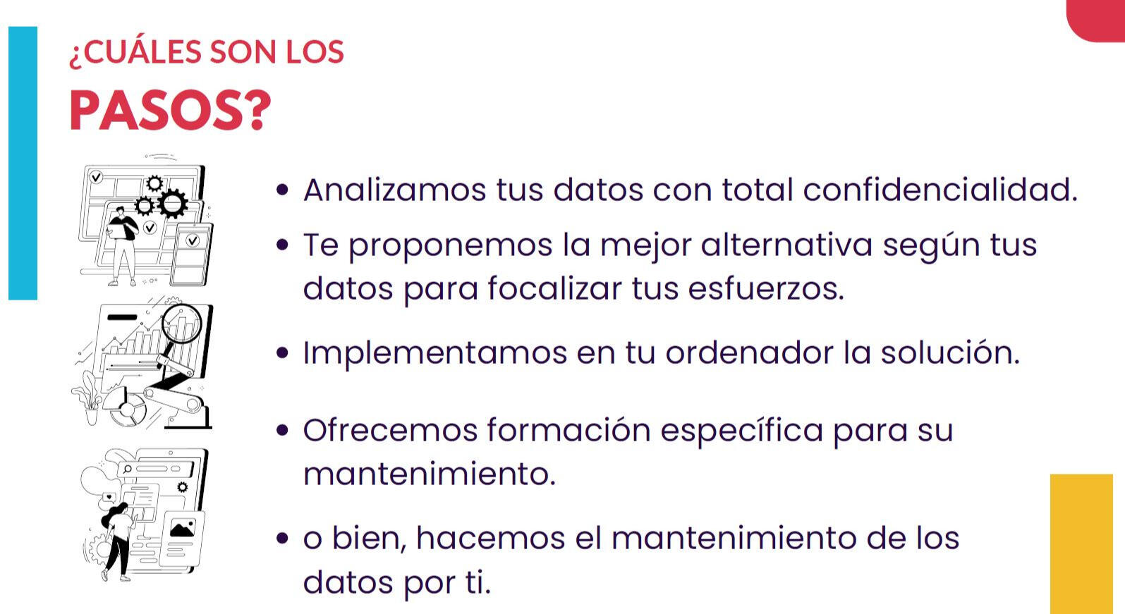 Implementamos y revisión Te damos la solución consensuada y formamos a tu equipo para que sigas aplicándolo.